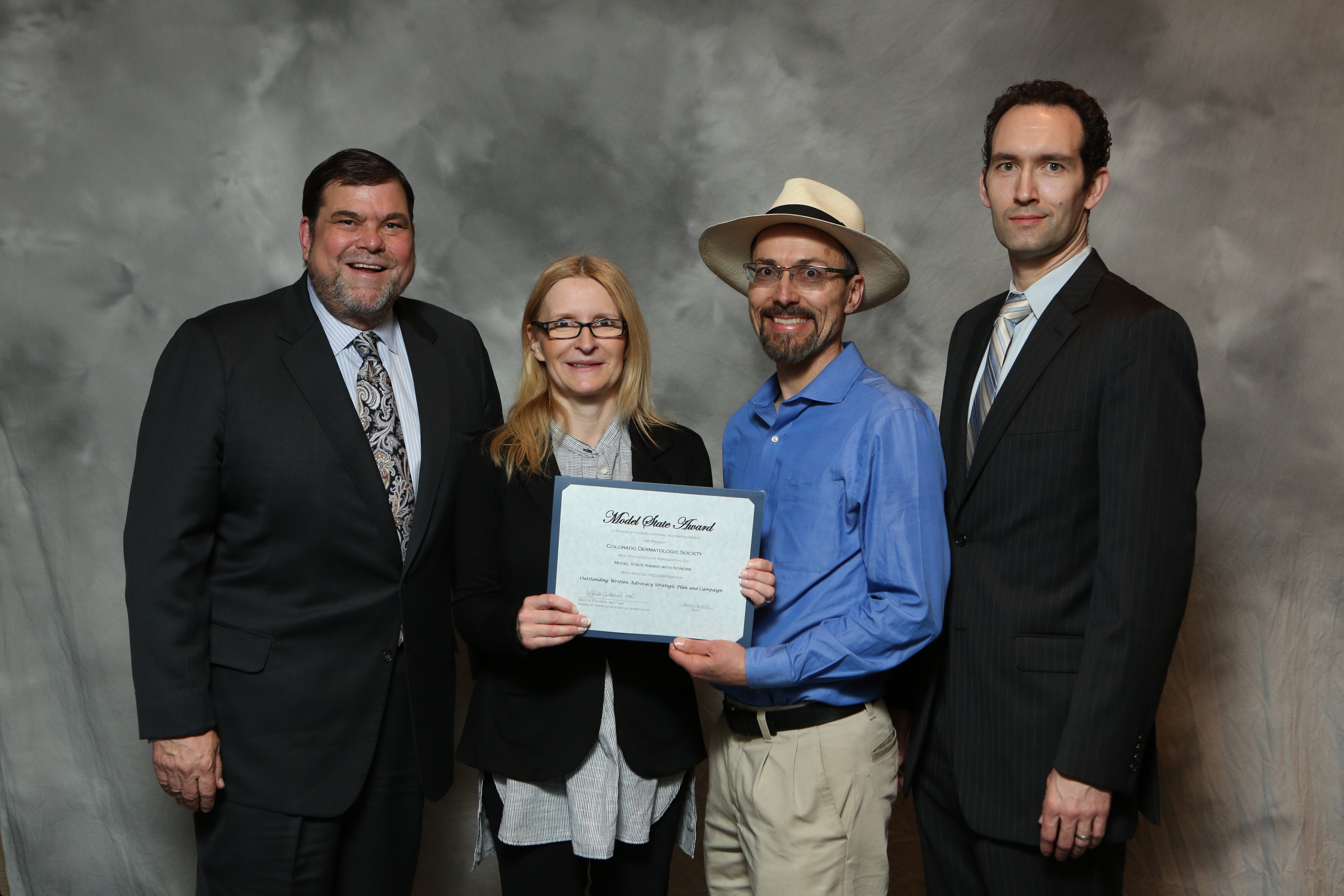 At the 2015 AAD Annual Meeting the CDS was presented the AAD Model State Award with Honors for our Written Advocacy Strategic Plan and Campaign. Sarolta Szabo, MD (CDS Past President), Robert Dellavalle, MD (CDS Legislative Trustee & Past President), and Theo Alkousakis, MD (CDS President Elect) were present to receive the award on behalf of the Colorado Dermatologic Society.